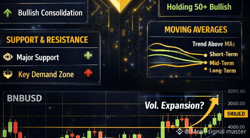 BNB Coin continua a mostrar força técnica e estabilidade, mesmo durante a incerteza mais ampla do mercado. Esta análise foca estritamente na ação do preço, indicadores e estrutura, sem notícias ou especulações.