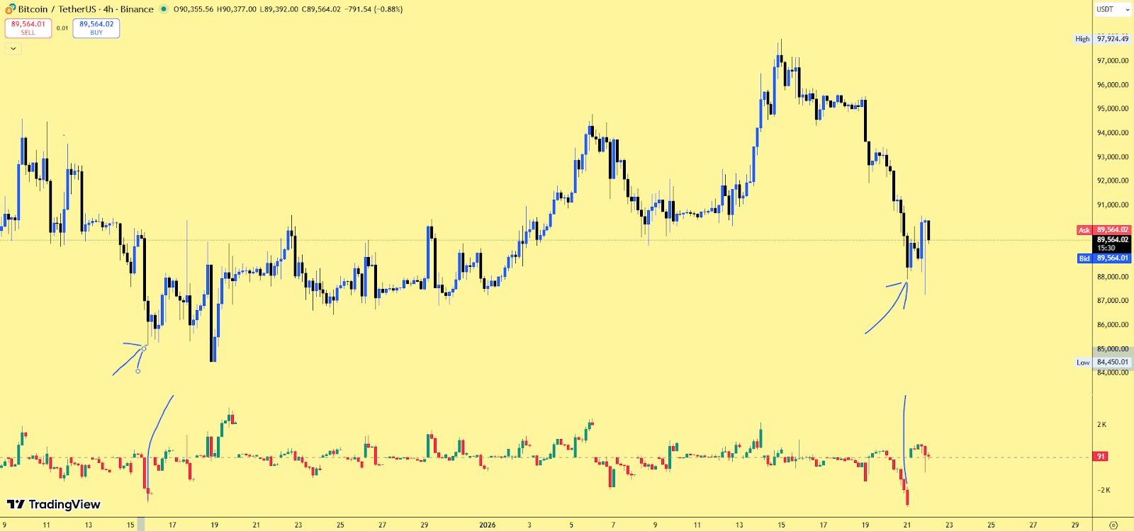 Demanda Spot: Enquanto os traders de derivativos estavam sendo destruídos, CVD Spot (Delta de Volume Cumulativo) mostrou compras agressivas nos mínimos de $87k (pico no volume delta e absorvido pela próxima vela). O dinheiro esperto usou o pânico das tarifas para encher suas bolsas.