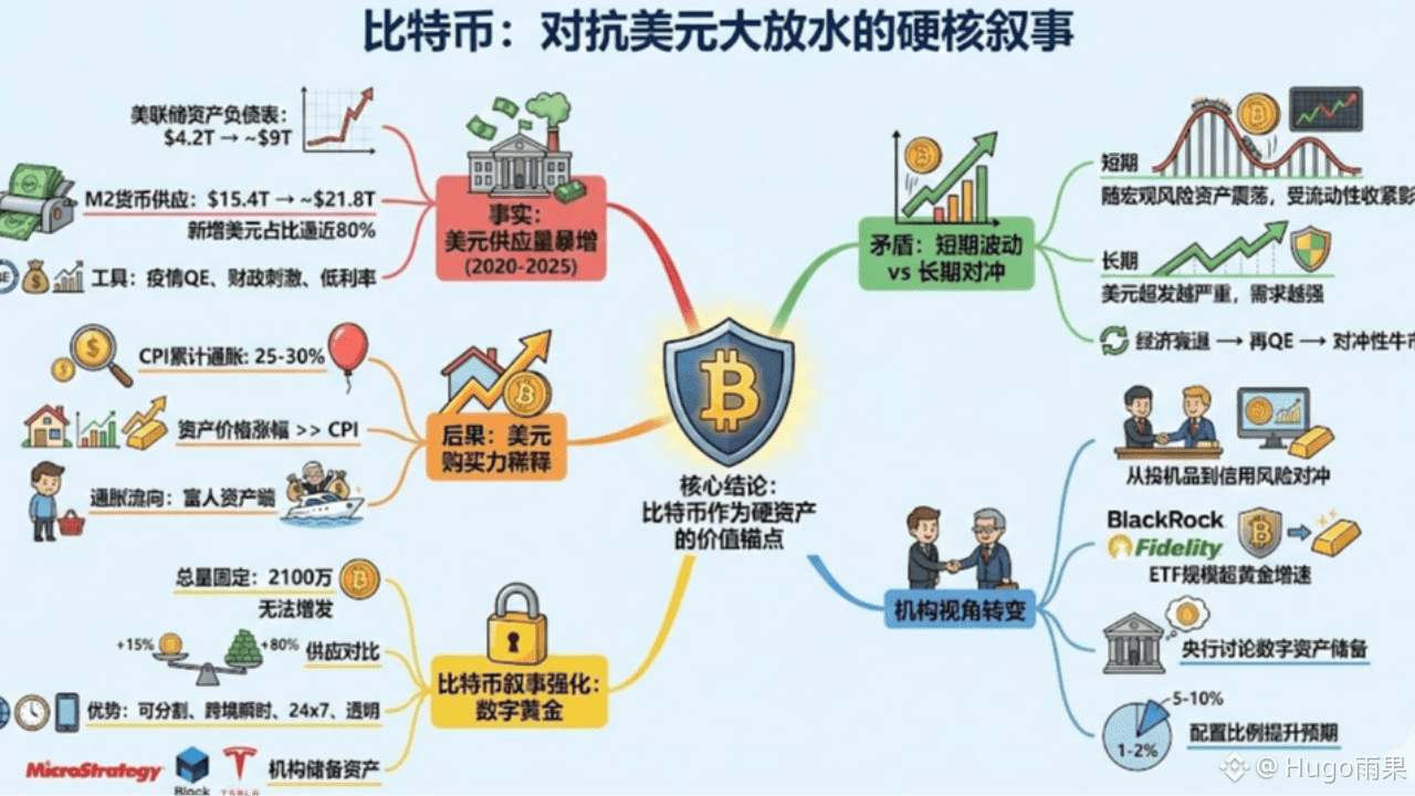 A longo prazo, quanto mais dólares forem emitidos excessivamente, maior será a demanda por ativos sólidos de 'oferta fixa e não soberana'. O grande mercado em alta de 2020-2021 foi essencialmente uma resposta à grande liquidez gerada pela pandemia; se em 2025-2026 houver novamente uma expansão sistemática da liquidez (recessão econômica → novo QE), o Bitcoin pode muito bem entrar em uma nova rodada de 'mercado em alta de hedge'.Mudança na perspectiva das instituições.