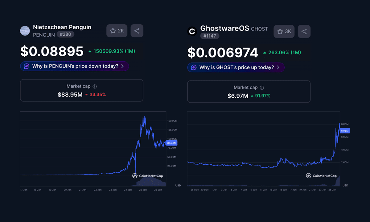 A queda de preço do Pinguim Nietzscheano foi acompanhada por um aumento do $GHOST. Embora os dois projetos sejam muito diferentes, com o GhostWareOS focado em utilidade orientada à privacidade e o $PENGUIN operando como um clássico jogo de meme, seus gráficos parecem cada vez mais interconectados. O tempo de ambos os movimentos sugere rotação de capital em vez de ação de preço isolada.