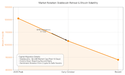 É uma distinção sutil, mas importante. Stablecoins não estão falhando; sua capitalização de mercado está simplesmente contraindo porque os detentores estão temporariamente realocando para preservar valor. Isso é um sinal reflexivo sobre o sentimento do investidor: a segurança está tomando precedência sobre a busca por retornos.