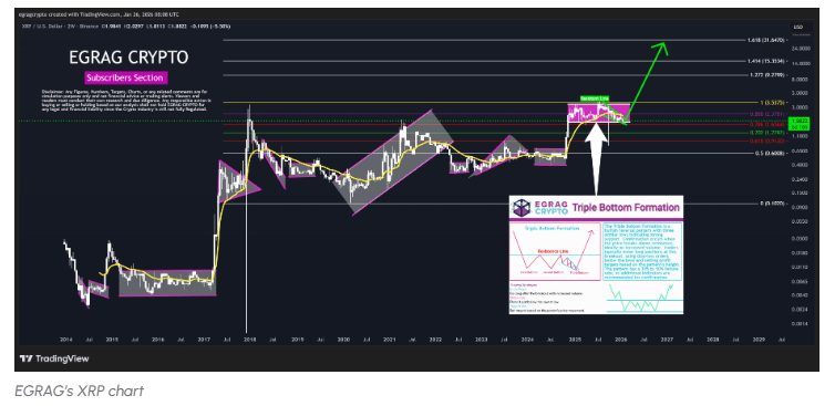 O analista EGRAG compartilhou uma perspectiva promissora para o XRP em sua última postagem no X. No centro da análise está uma formação de Fundo Triplo, uma configuração clássica de reversão que marca o fim de uma consolidação prolongada.