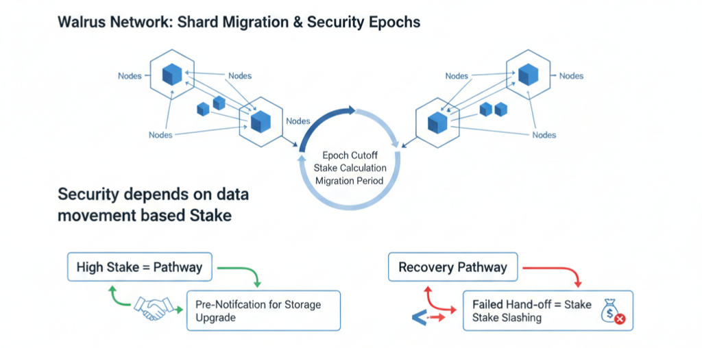 Se os dados ficassem no mesmo lugar para sempre, um pequeno grupo de agentes maliciosos poderia eventualmente mirar nesses pontos específicos e tentar bagunçar as coisas. Ao mover os shards, o Walrus garante que nenhum grupo único possa ter um controle permanente sobre qualquer parte do sistema.
