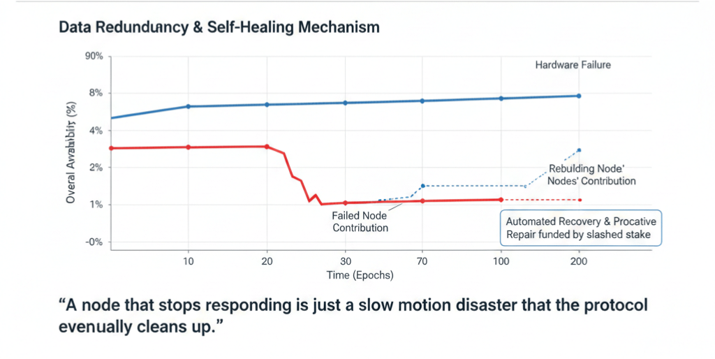 Mesmo que um nó se torne totalmente não responsivo, o sistema é projetado para eventualmente mover esses shards para longe e manter a rede saudável. Não é sempre bonito e pode ser caro para aqueles que não seguem as regras, mas funciona.