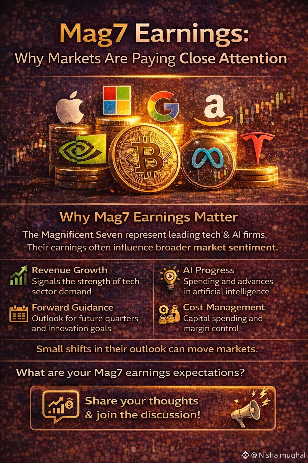 The upcoming Mag7 (Magnificent Seven) earnings season is a major focus for global financial markets. The group—Apple, Microsoft, Alphabet, Amazon, Nvidia, Meta, and Tesla—represents a significant share of market capitalization and has been a key driver of recent market performance.