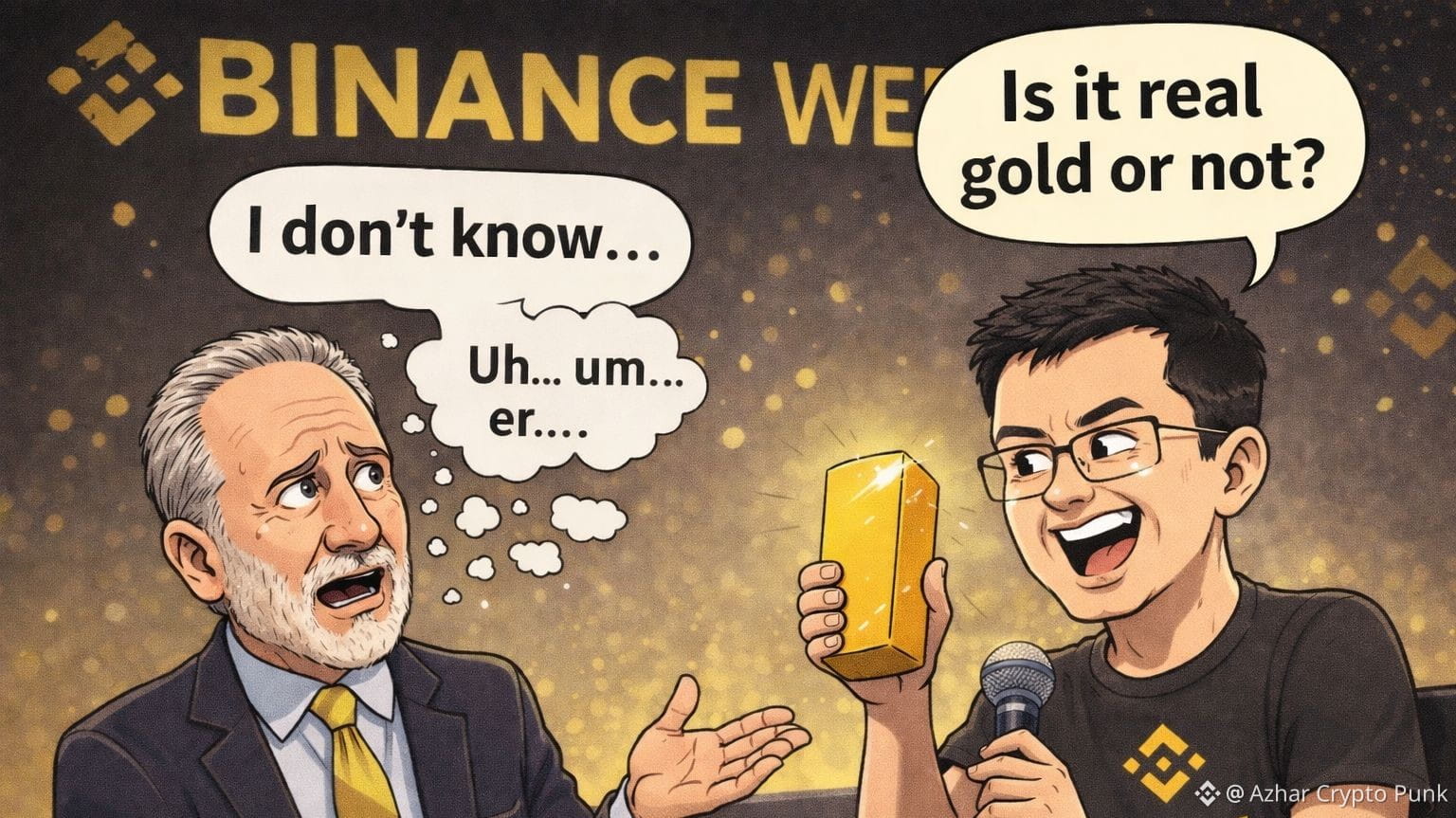 O momento mais engraçado na Binance Week Dubai 2025 não veio de um gráfico, uma palestra ou uma previsão de preço. Veio quando CZ casualmente entregou a Peter Schiff um pedaço de ouro e fez uma pergunta que deveria ter sido fácil para o maxi de ouro mais barulhento do mundo: “Isso é ouro de verdade?”