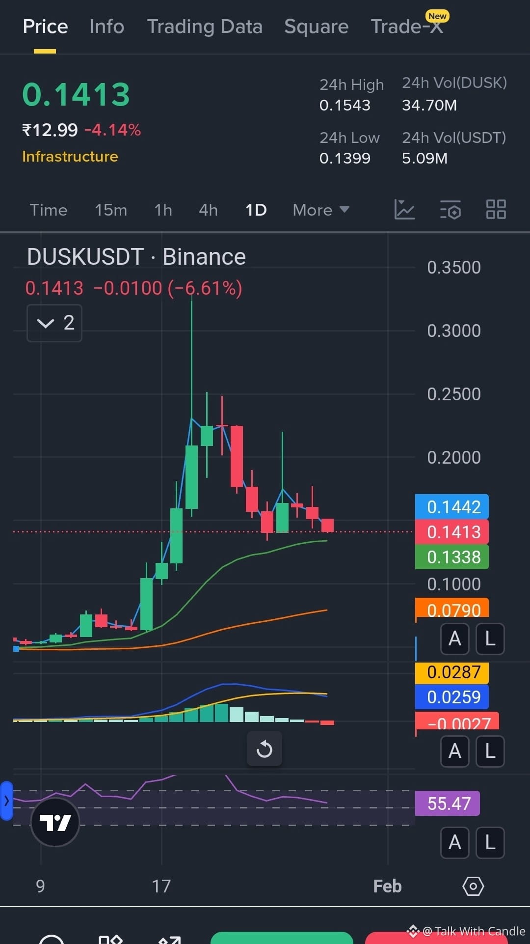 $DUSK Network delivers privacy infrastructure for regulated finance—now trading at prime levels! Current price $0.1413 shows higher lows forming after testing $0.135 support, with 24h volume exploding to $930M despite -12% correction.
