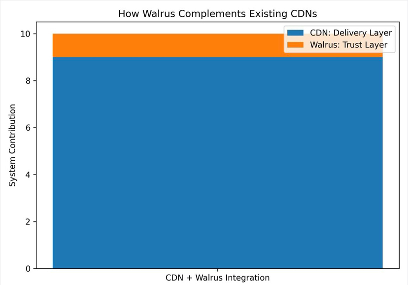 Este é o contexto em que o Walrus faz sentido. O Walrus não está tentando combater as redes de entrega de conteúdo (CDNs) existentes. Não está se posicionando como uma alternativa por atacado ao Cloudflare, Akamai ou Fastly. Em vez disso, trata-os como o que já são: as camadas de entrega mais rápidas e otimizadas que temos — mas que carecem de garantias de longo prazo em torno da permanência dos dados, verificabilidade e confiança.