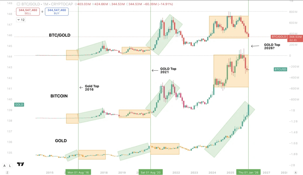 Entre o ouro e o bitcoin, de ciclo em ciclo, observa-se a mesma regularidade. Enquanto o metal precioso está na fase de crescimento principal, o mercado de criptomoedas permanece em consolidação. Após o término do rali do ouro, o capital se desloca para ativos digitais, o que inicia seu rali de alta.