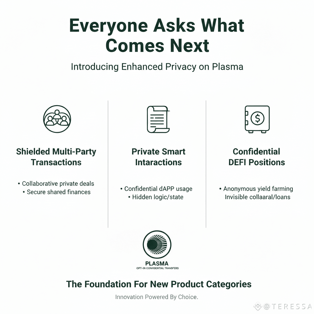 Everyone keeps asking what comes next. Plasma is exploring enhanced privacy features—shielded multi-party transactions, private smart contract interactions, confidential DeFi positions. The foundation of opt-in privacy opens up entire product categories that weren't previously viable.
