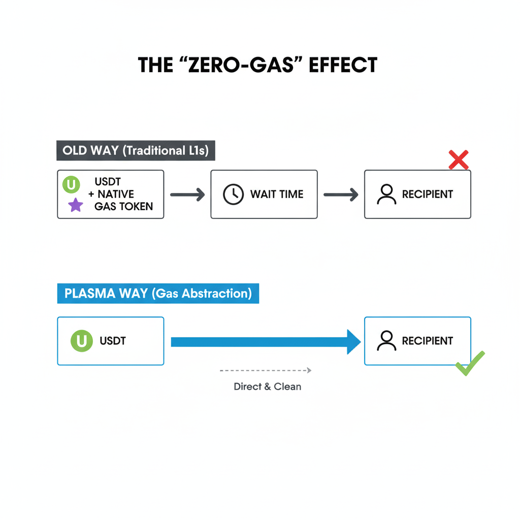 Na maioria das redes, transferir um ativo atrelado ao dólar exige que você possua um token "gas" separado e volátil (como ETH ou SOL). Isso cria uma barreira psicológica e financeira. Por que um usuário deve ser forçado a comprar um ativo especulativo apenas para enviar dólares digitais?