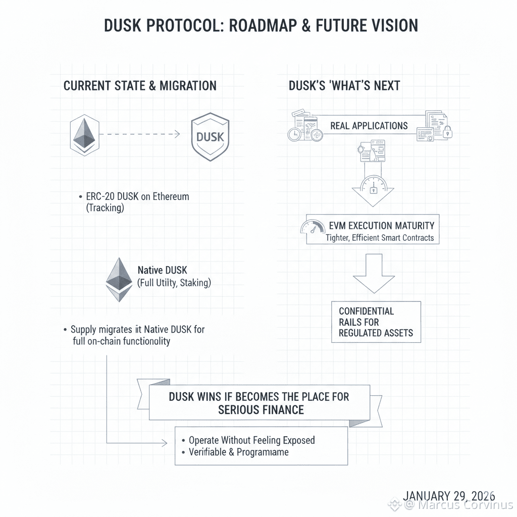Dusk’s “what’s next” is where the story gets interesting for me: more real applications shipping on the network, tighter execution maturity through the EVM lane, and deeper adoption of confidential rails for regulated-style assets. Dusk wins if it becomes the place where serious finance can operate without feeling exposed, while still being verifiable, programmable, and settlement-sound.
