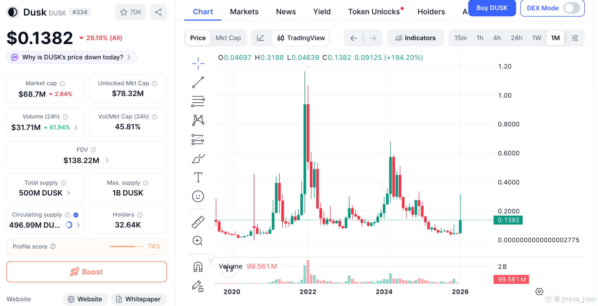 DUSK’s chart tells a familiar crypto story — explosive rallies, brutal drawdowns, long consolidations, and sudden bursts of volume when attention returns. The spike into 2022, the secondary surge in 2024, and the long compression afterward aren’t random noise. They reflect cycles of speculation colliding with something deeper: a protocol quietly building infrastructure for regulated, privacy-preserving capital markets while traders chase the next macro wave.