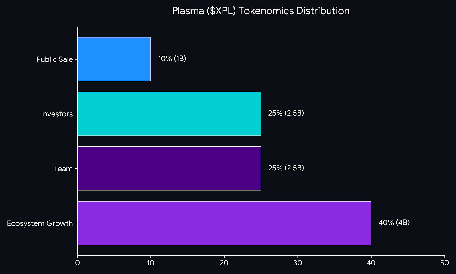 A distribuição de tokens é dividida da seguinte forma: 40 por cento (4 bilhões de XPL) do token vai para crescimento do ecossistema, financiamento de parcerias, liquidez e subsídios. Quando foi lançado, 800 milhões desses foram desbloqueados, com o restante vestindo mensalmente nos próximos três anos.