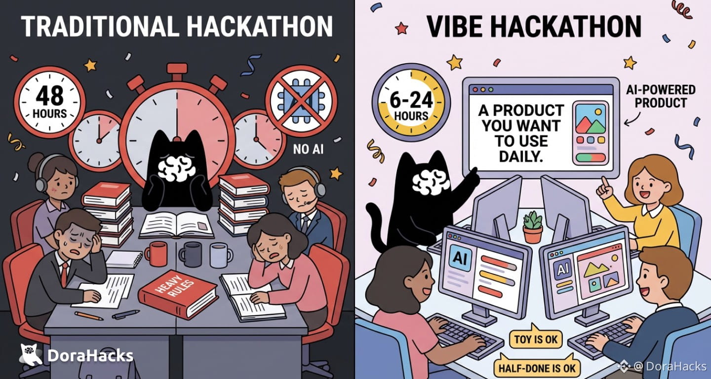 Vibe hackathons could be 6-24 hours, organized weekly or monthly. Failure is allowed. Looking like a toy is allowed. Half-finished is allowed.