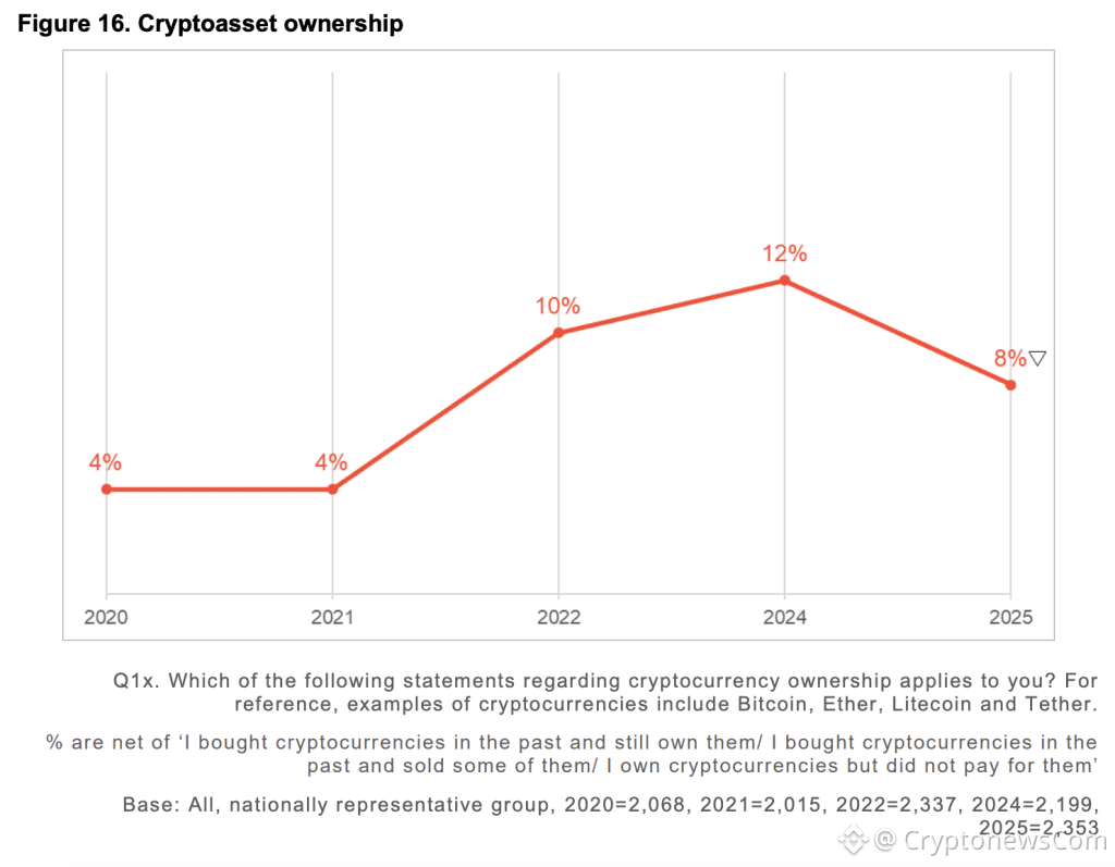 Of particular note is this: despite Bitcoin trading well above $110,000 when thousands of Britons were polled, there’s been a sharp drop in the number of consumers who invest in digital assets.
