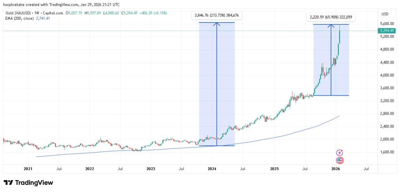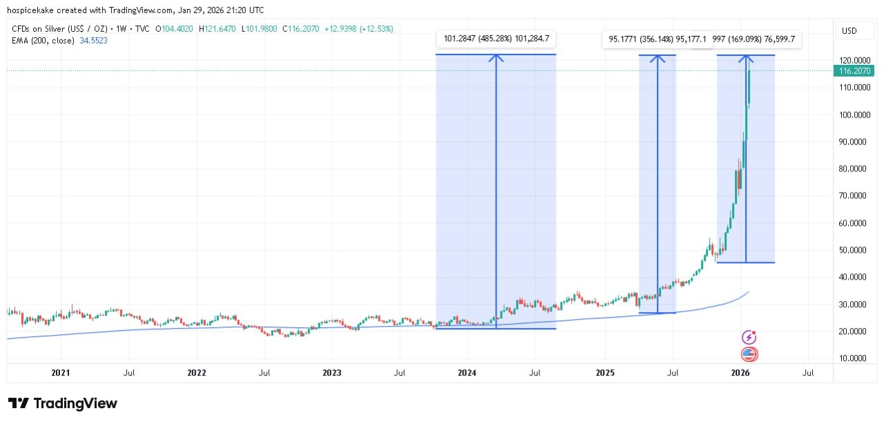 A prata (Silver), muitas vezes subestimada, exibe números ainda mais espetaculares: +485 % desde 2024, +356 % desde 2025, e +169 % nos últimos três meses.