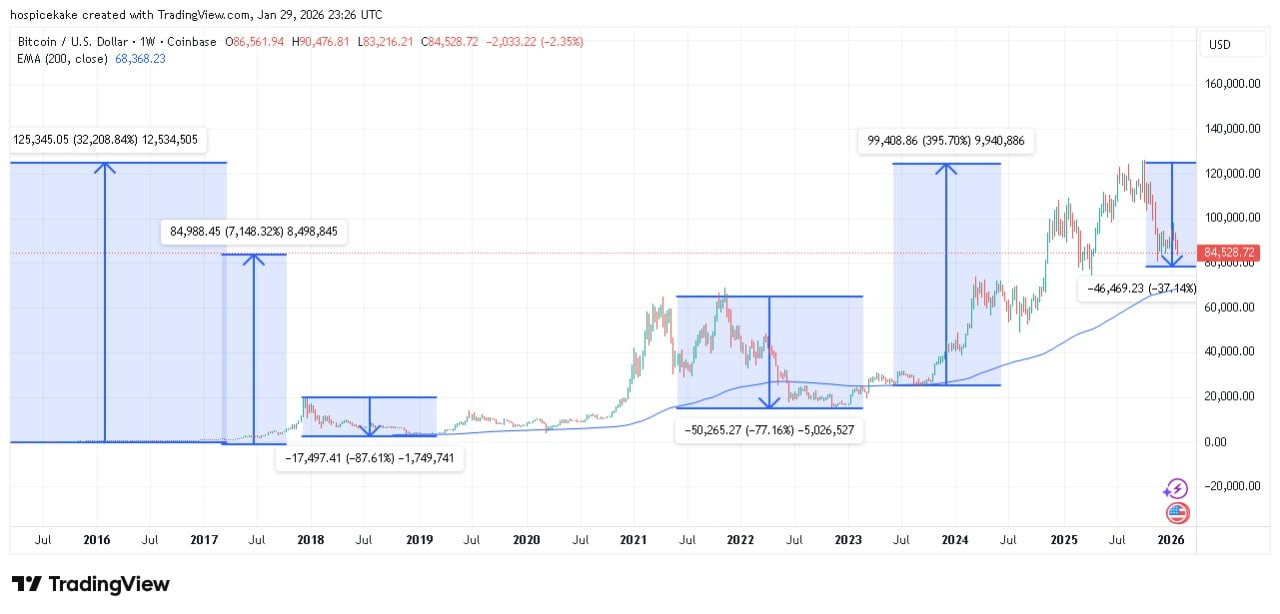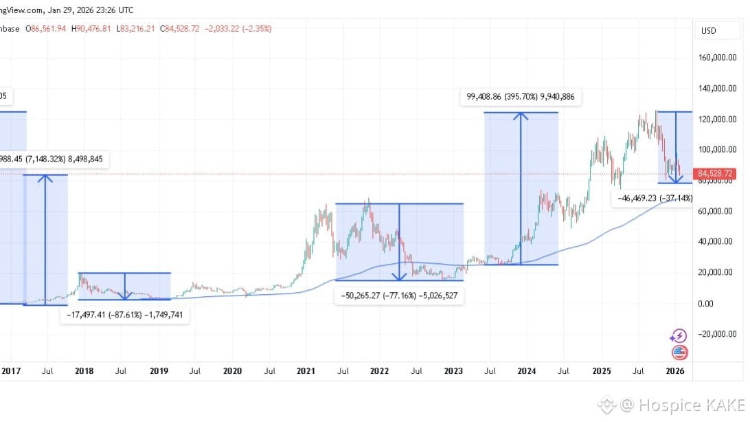 Entre 2015 e 2025, ao nível de preço atual, o Bitcoin exibe mais de +7000 % de performance acumulada. Um número que só foi possível ao custo de uma disciplina extrema: -87 % de correção em 2019 e -77 % em 2022, períodos durante os quais era necessário não vender para aproveitar o ciclo completo.