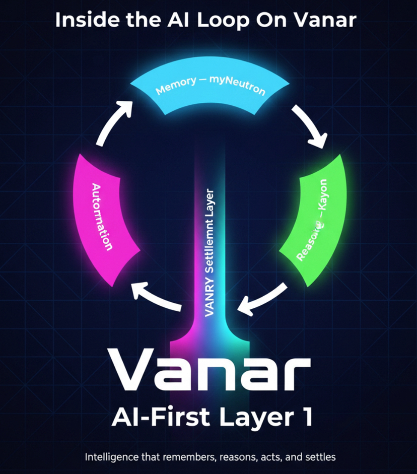Essas três camadas — memória, raciocínio e automação — formam um ciclo interno. A memória informa o raciocínio. O raciocínio molda a ação. A ação desencadeia a liquidação. Em vez de a inteligência viver off-chain e tocar a blockchain apenas no passo do pagamento, a Vanar mantém mais desse ciclo dentro do sistema.