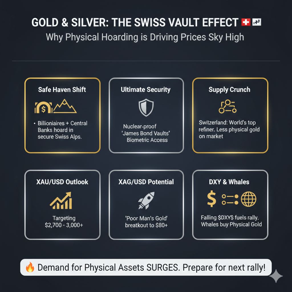 Físico vs. Papel: A tendência atual na Suíça revela uma mudança significativa—"Baleias" (grandes investidores institucionais) estão acumulando agressivamente ativos físicos (barras reais) em vez de apenas ouro "papel" (ETFs ou futuros). Isso indica uma falta de confiança em sistemas digitais e uma preferência por riqueza tangível.