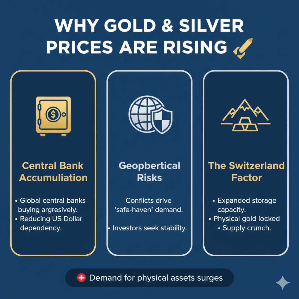 Escassez de Oferta: Como o maior centro de refino do mundo, a movimentação da Suíça para trancar o ouro físico em cofres está reduzindo a oferta de mercado, o que está elevando os preços.