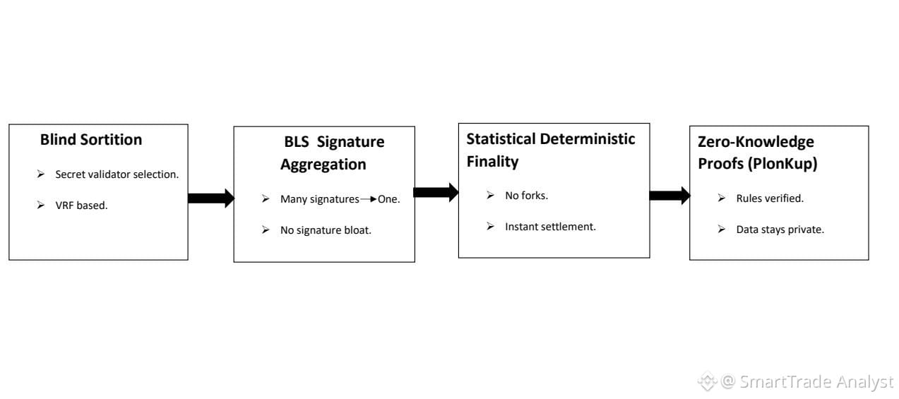 Here’s how it works: when Provisioners (think of them as validators) submit their attestation, they’re actually confirming the accuracy of a complex ZKP attached to the block. This proof shows that every rule is followed, from making sure the sender has enough funds to checking all the KYC and AML boxes. And the crazy part? The Provisioner never sees who the sender is or how much money is involved. That’s what makes “Blind Verification” possible. With @dusk_foundation’s setup, the network agrees that a transaction is legit, but the details stay locked away behind encryption. By bringing together Blind Sortition, BLS Aggregation, and Zero-Knowledge proofs, $DUSK does something nobody else can: it creates a privacy-first foundation for the global financial system. It’s not just a step forward—it’s something entirely new.
