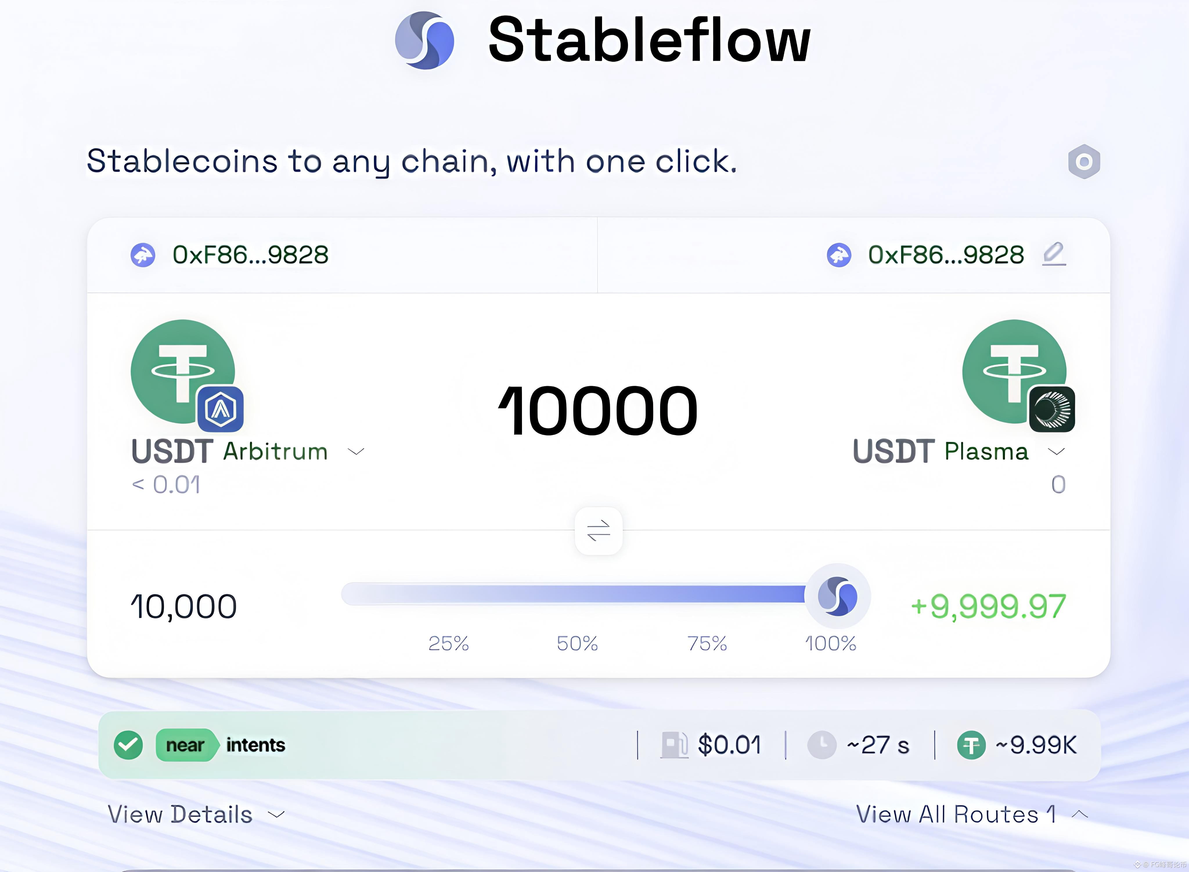 这不是零售级别的“小打小闹”,而是针对机构和鲸鱼级玩家的优化。想象一下:在传统跨链桥上,大额转移往往面临高滑点(价格偏差)和Gas费的双重痛点,StableFlow通过集成NEAR Intents技术,实现CEX级别的定价和执行效率。