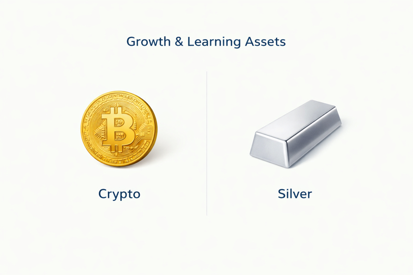 Os quarenta dólares restantes podem ser usados para exposição e aprendizado. Esta parte do portfólio não se trata de segurança. Trata-se de entender como diferentes mercados se movem. Você pode dividir esse montante entre cripto e prata.