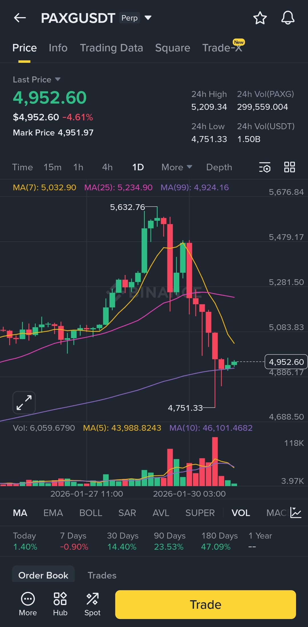 Essa dinâmica agora mudou. Uma vez que o ouro se tornou totalmente negociável em uma plataforma nativa de criptomoedas 24/7 como a Binance, ele entrou em um ambiente onde os preços se ajustam em tempo real, não em sessões.