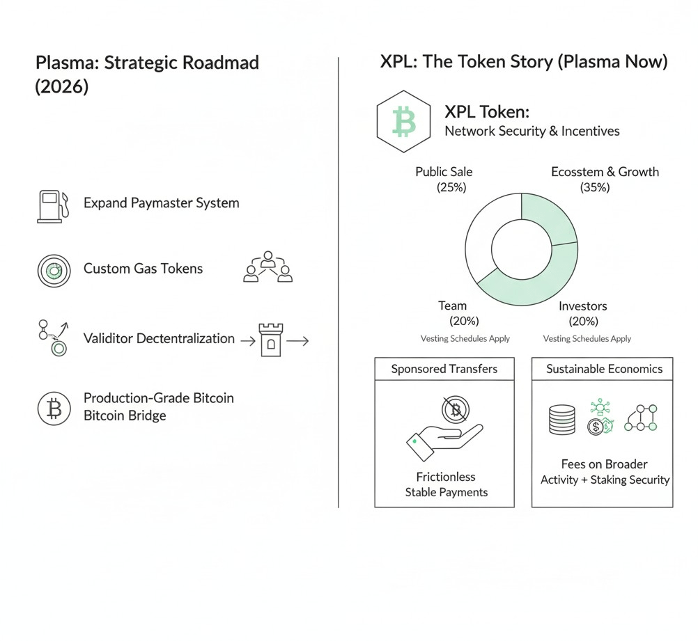 Plasma precisa expandir e reforçar o sistema de paymaster para que transferências de stablecoin sem gás permaneçam suaves, mesmo quando o uso aumenta. Precisa enviar tokens de gás personalizados de uma maneira que seja simples para carteiras e segura em nível de protocolo. Precisa continuar o caminho de descentralização dos validadores para que a rede não seja apenas rápida, mas também resiliente e neutra. Precisa transformar a arquitetura da ponte Bitcoin em um sistema de grau de produção que ganhe confiança, não apenas atenção. E precisa fazer crescer o Plasma One e os parceiros do ecossistema de uma maneira que prove que há uma demanda real por pagamentos em stablecoin no Plasma, não apenas atividade especulativa.