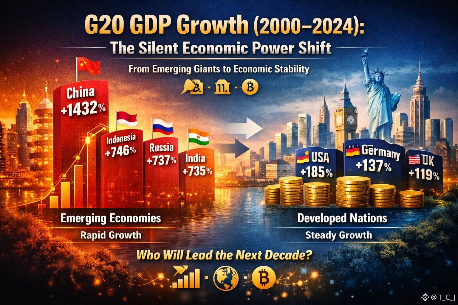 Between 2000 and 2024, the global economy experienced one of the most dramatic transformations in modern history. While headlines often focus on short-term market volatility, interest rates, or inflation cycles, the real story lies in long-term GDP growth trends among the world’s largest economies. The G20 data reveals a powerful shift in economic momentum — one that has deep implications for investors, policymakers, and crypto market participants alike.