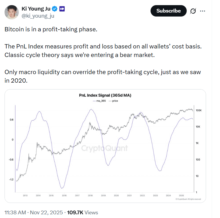 De acordo com a CryptoQuant, a venda está se desenrolando em um contexto de desaceleração dos fluxos de capital. O CEO Ki Young Ju observou que a capitalização realizada do bitcoin estagnou em grande parte, um sinal de que novo dinheiro parou de entrar no mercado.