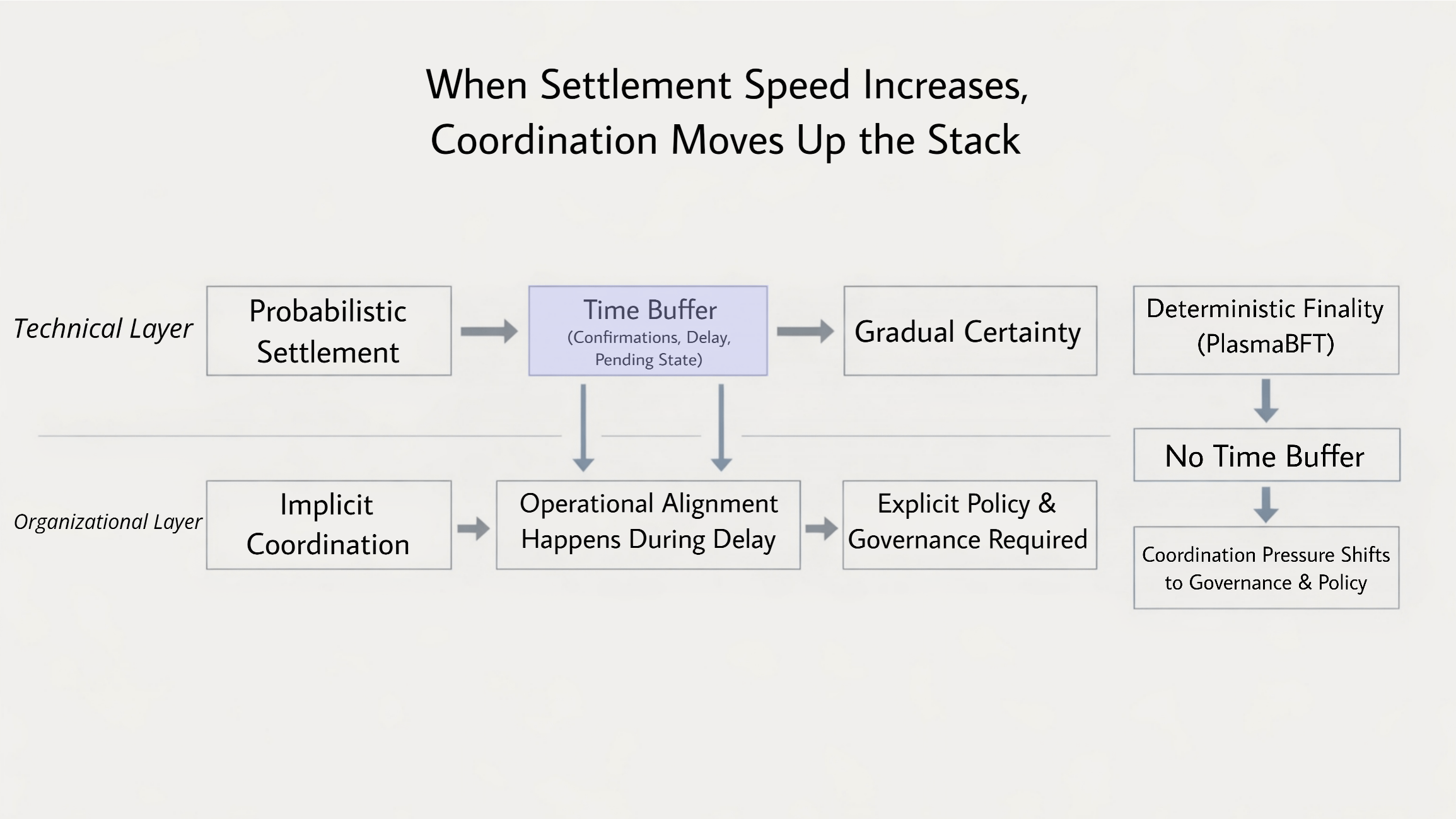 A indústria frequentemente enquadra a liquidação mais rápida como uma corrida em direção a zero latência. Mas a mudança mais profunda é arquitetônica. À medida que o consenso acelera, a coordenação deve se profissionalizar. A questão deixa de ser “já foi resolvido?” e se torna “estamos prontos para agir?”