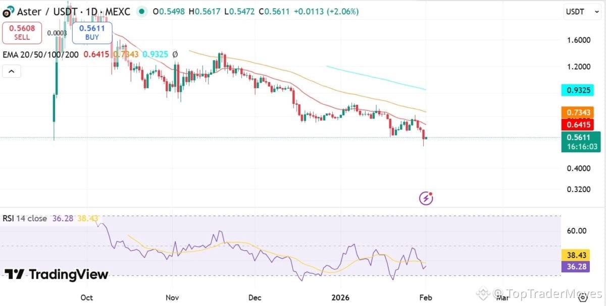 As of writing, $ASTER trades at $0.552 (-7% daily), extending its week-long bearish structure.