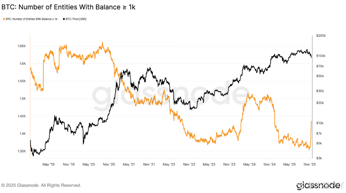 鲸鱼(1000-10,000+ BTC地址)进入“轻度积累”阶段,过去30天净增持,积累速度创2024年来新高!