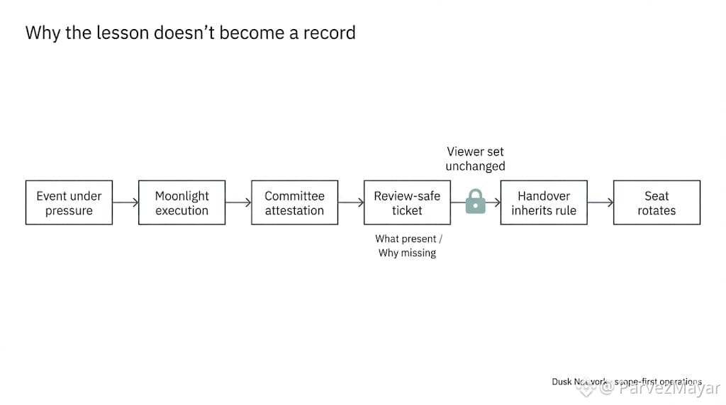 You see it in habits, not logs. On public systems, people over-record and regret it later. Here, nobody wants to widen entitlements just to make a lesson legible. So the lesson stays inside the role that saw it, and handoff becomes the only transport it gets.