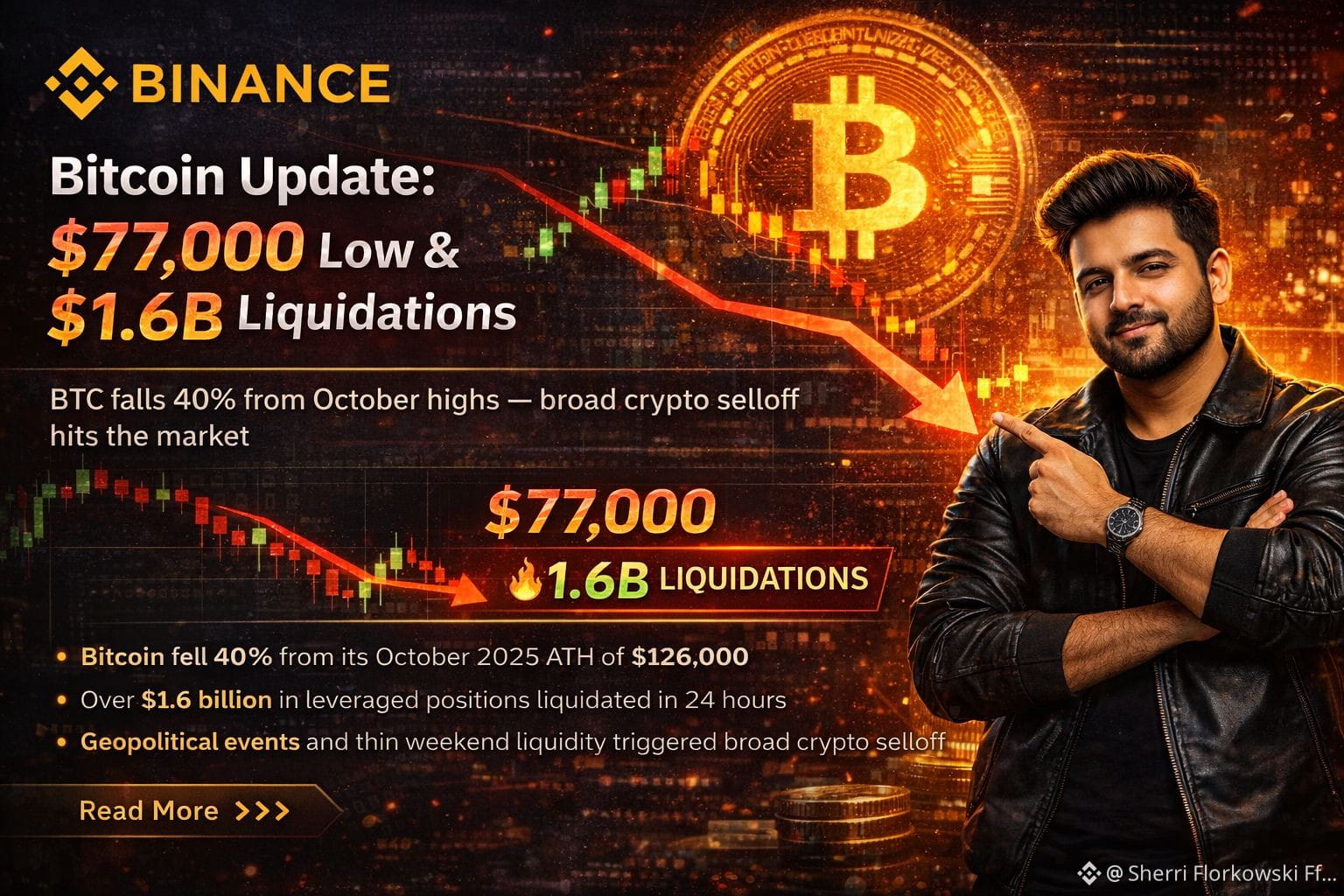 Headline: “Bitcoin$BTC Update: $77,000 Low & $1.6B Liquidations”