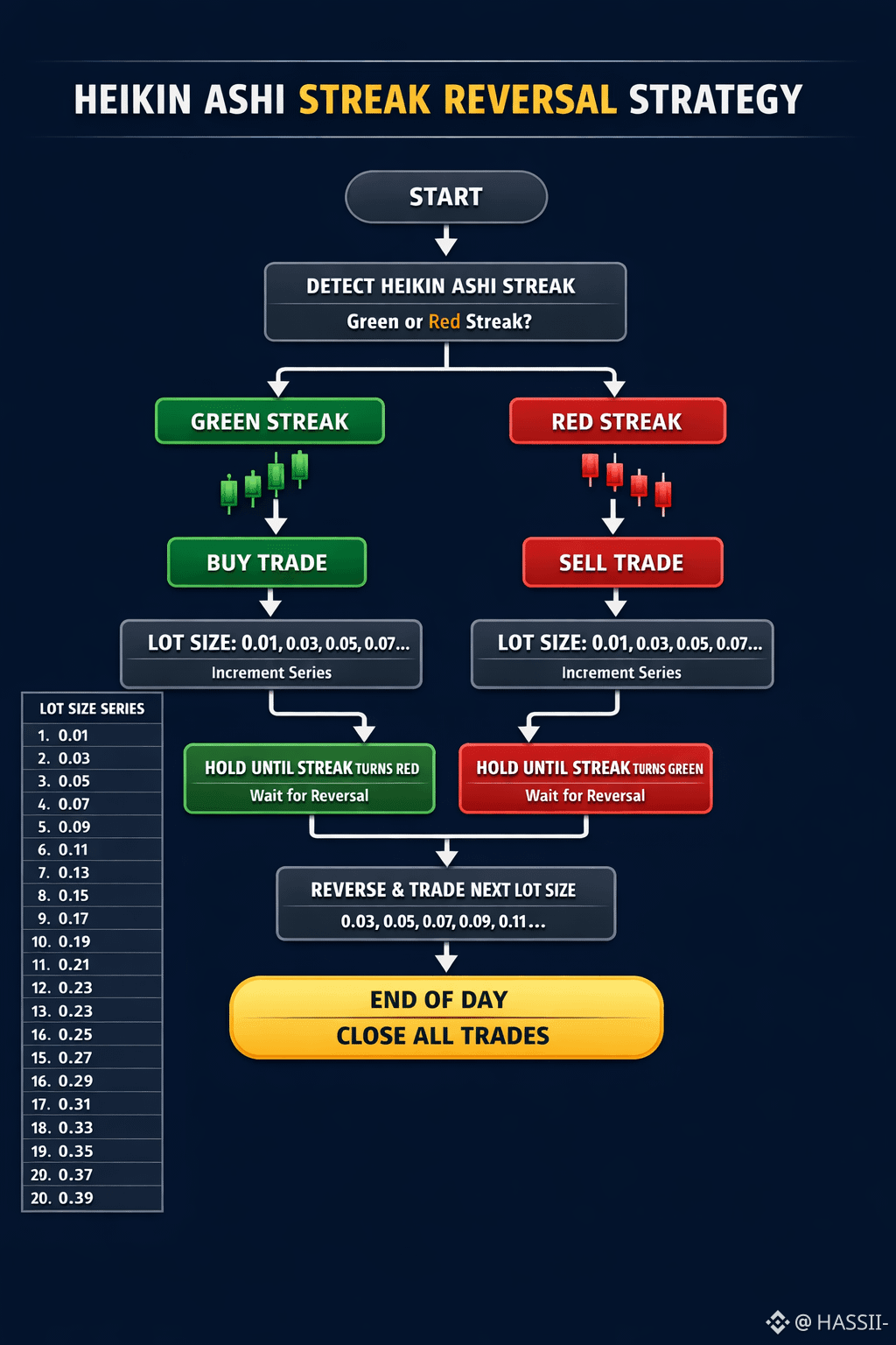 • When the streak flips (green → red or red → green), open a new trade with next lot in the series.