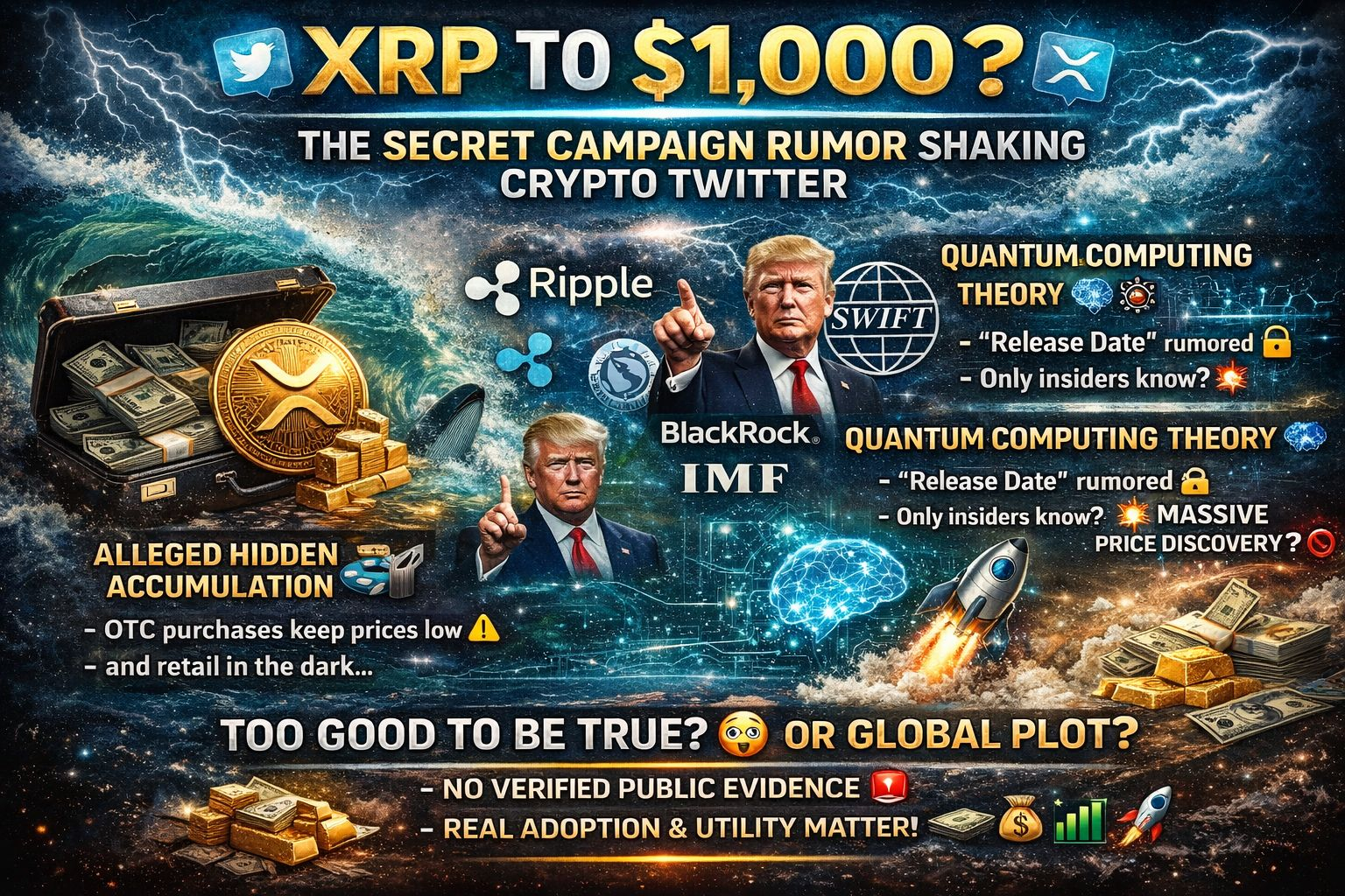 A narrativa alega que Donald J. Trump, ao lado da Ripple, BlackRock, SWIFT e até mesmo o FMI, está de alguma forma envolvido em um plano nos bastidores.