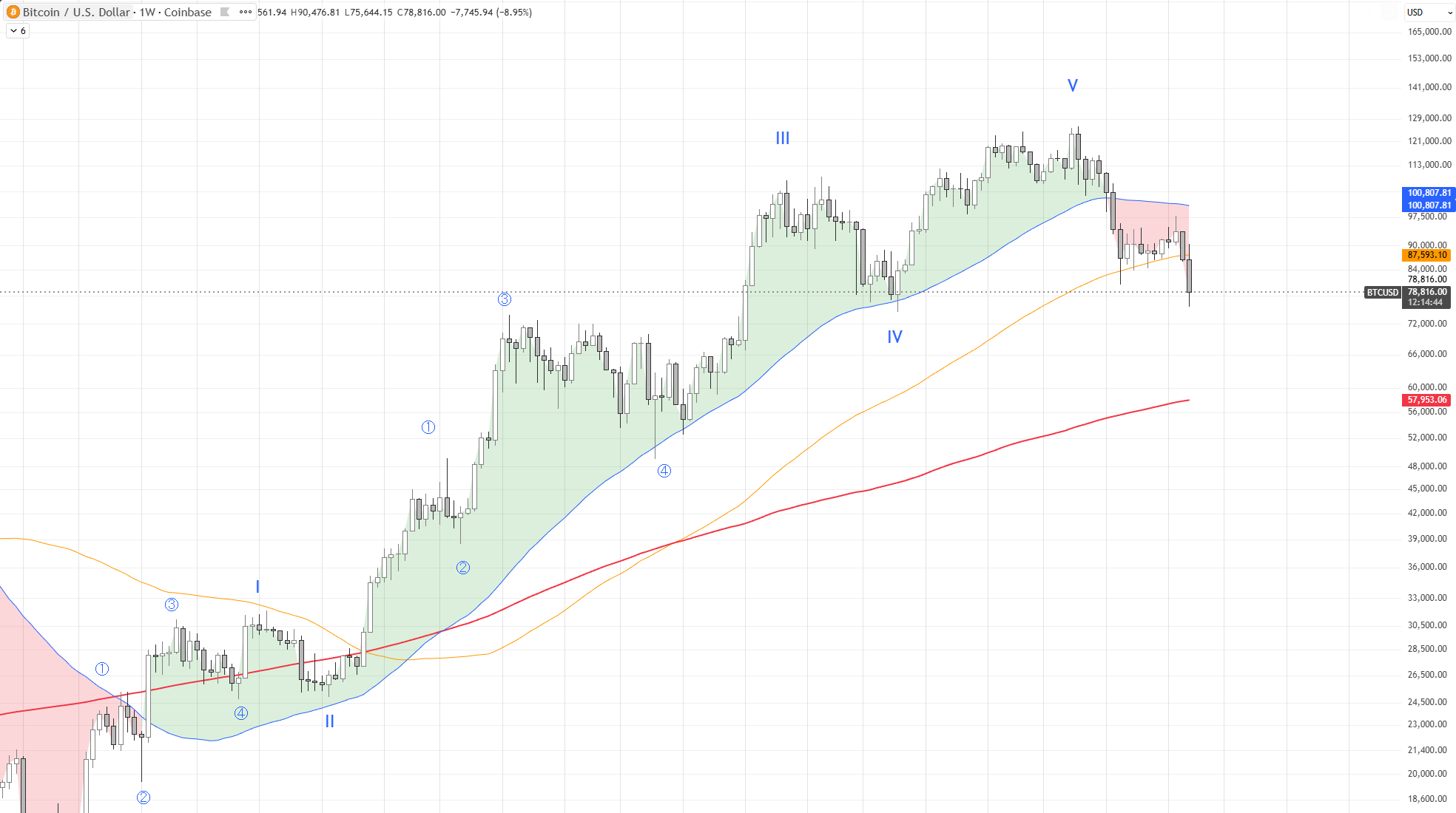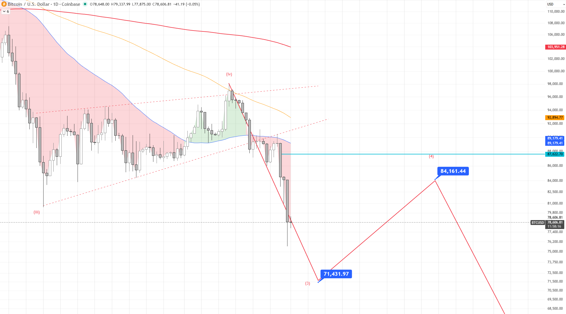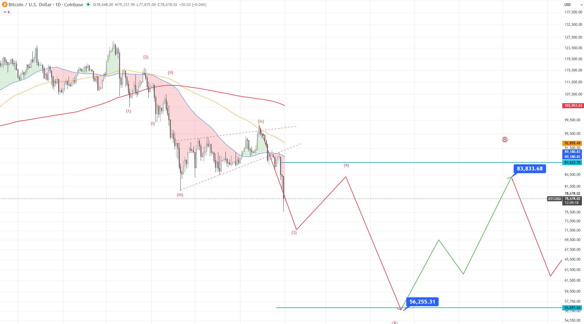 A região-alvo potencial para a onda A está em torno de $56K, coincidindo com o MA200 no quadro semanal. Este é um nível preditivo baseado nos dados atuais e precisará ser monitorado, ajustado de acordo com a reação real dos preços.