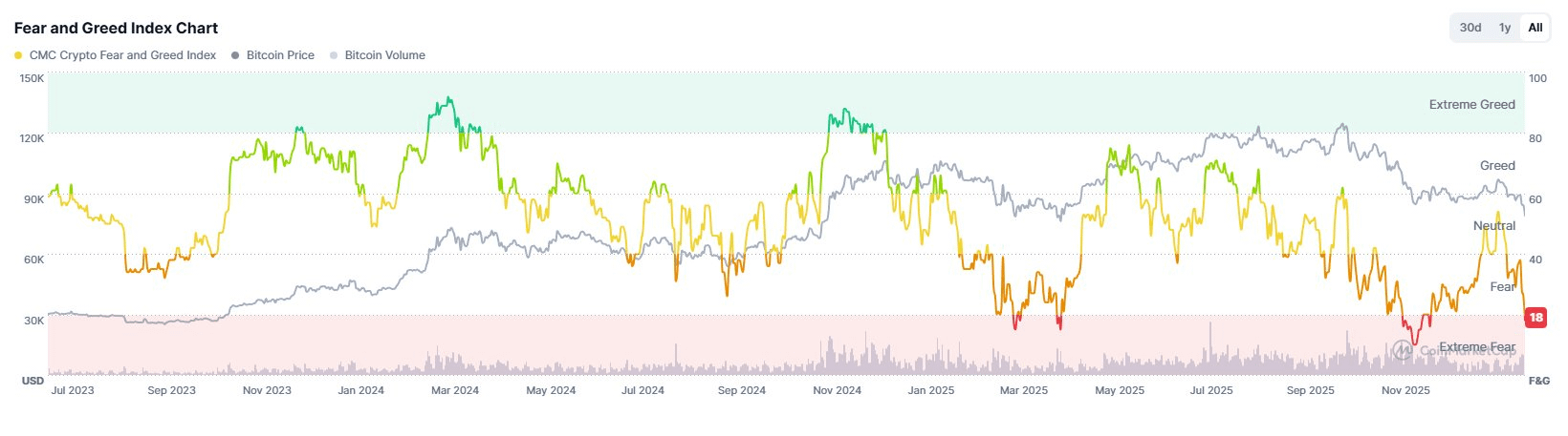O índice Fear & Greed Index, após se recuperar para o nível de 54 quando o Bitcoin atingiu $97K, caiu para 18 quando o preço do Bitcoin ajustou para $75K.