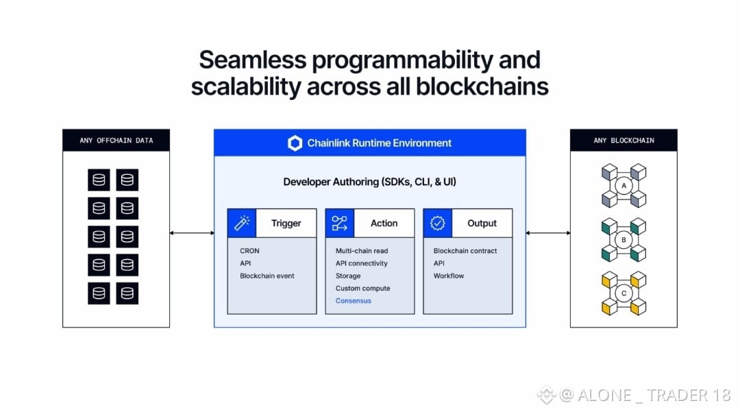 Since Chainlink underpins the four standards above, it’s the ideal platform for coordinating, managing, and automating the execution of complex workflows across multiple oracle services and various onchain and offchain systems. The Chainlink platform, powered by the Chainlink Runtime Environment, enables developers and institutions to seamlessly combine blockchains, legacy systems, real-world data, cross-chain interoperability, compliance policies, and privacy capabilities into a single piece of workflow orchestration code, which is reusable, easily modifiable, and executable in a decentralized manner.