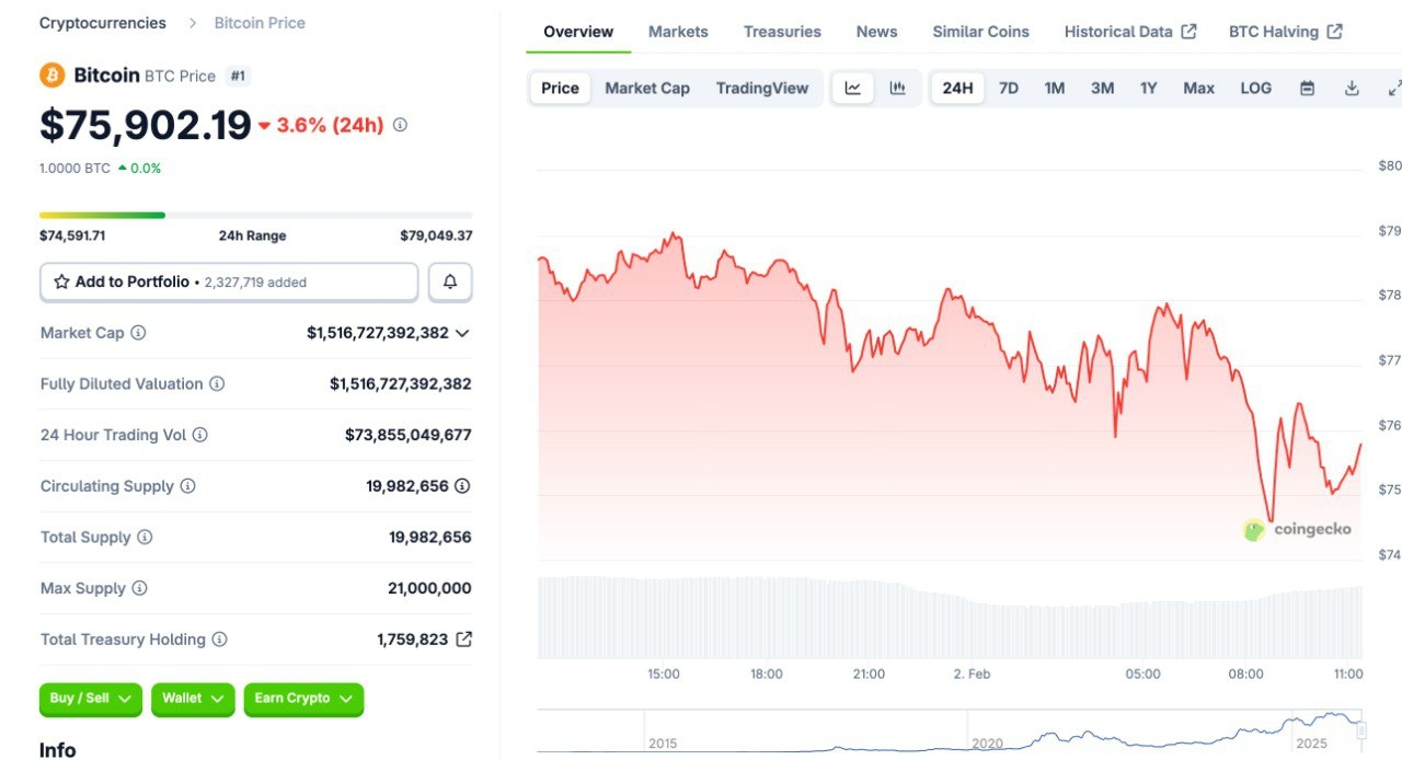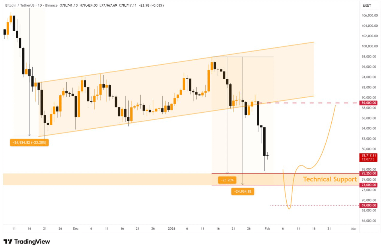 A partir de hoje, o Bitcoin caiu abaixo de níveis críticos de suporte. Depois de flertar com $98,000 em meados de janeiro, o BTC agora está lutando para manter a marca de $88,000.