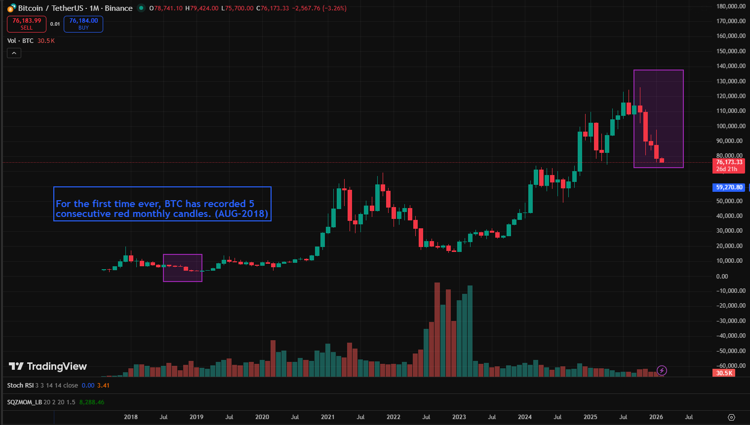 Na história inteira do Bitcoin, imprimir quatro velas vermelhas mensais consecutivas é um evento extremamente raro e bearish. A última vez que vimos esse padrão específico foi em agosto de 2018.