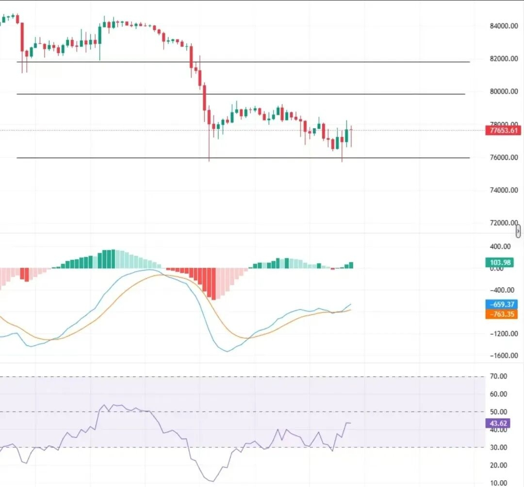 Sob a dupla pressão da incerteza econômica e política, o mercado de criptomoedas continuou a exibir um padrão de flutuação descendente. No fim de semana, o preço do Bitcoin passou por grandes oscilações, chegando a cair para a proximidade de 76000 dólares. Embora tenha ocorrido uma recuperação técnica posteriormente, após atingir 79500 dólares, o preço novamente enfrentou pressão e recuou. Na manhã de segunda-feira, o preço do Bitcoin caiu novamente, atingindo um mínimo de 75700 dólares, quase revertendo toda a amplitude da recuperação anterior, e atualmente se mantém acima de 77000 dólares em uma correção fraca.