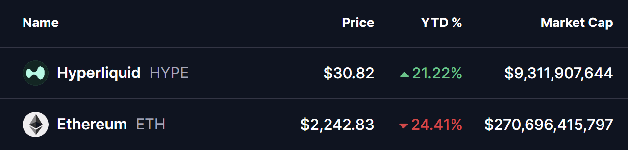 HYPE, o token nativo da Hyperliquid — uma das plataformas de negociação perpétuas descentralizadas que mais cresce — continuou a mostrar força relativa apesar de uma queda mais ampla no mercado de cripto. Enquanto ativos principais como Ethereum (ETH) sofreram uma queda acentuada de 24% no acumulado do ano, HYPE conseguiu se manter otimista, registrando ganhos de mais de 21% durante o mesmo período.