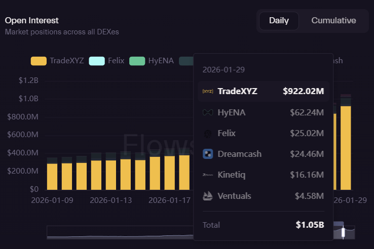Ao longo da última semana, o volume diário de negociações nos mercados HIP-3 subiu para aproximadamente $4,83 bilhões, marcando um novo recorde histórico. Ao mesmo tempo, o interesse em aberto (OI) subiu para um recorde de $1,05 bilhões, impulsionado em grande parte pela crescente demanda por exposição a commodities em cadeia.