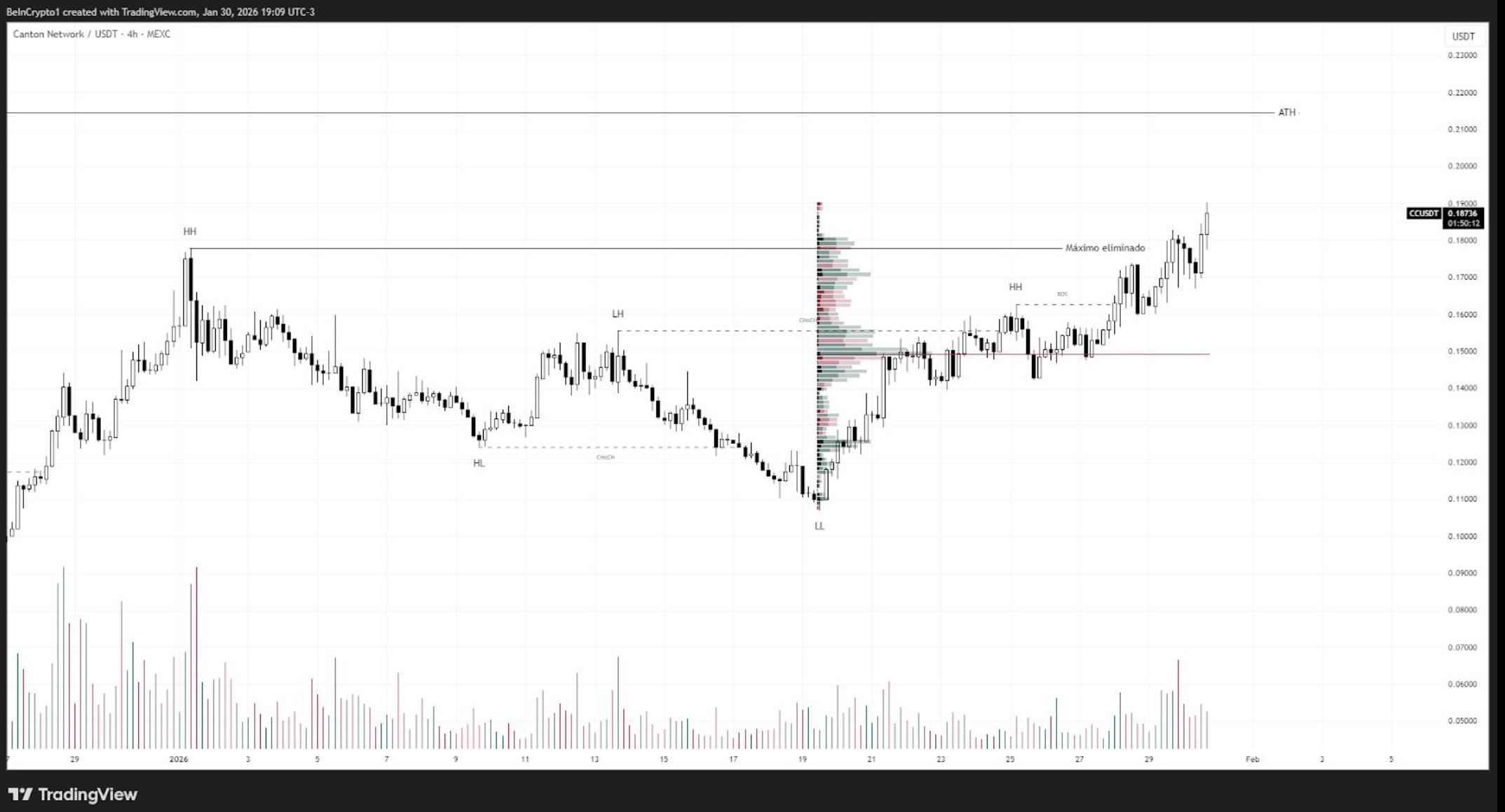 Canton Network ganhou protagonismo após eliminar uma resistência histórica e consolidar acima dela. O gráfico mostra uma sequência ordenada de máximos e mínimos crescentes, com aceitação clara do preço sobre o nível de 0,15 USDT.