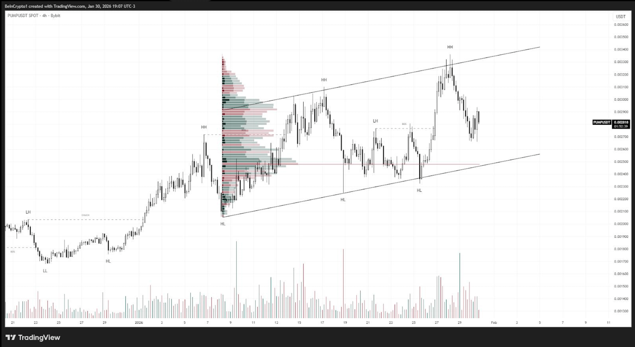 Enquanto o preço se mantiver dentro do canal e acima do suporte próximo a 0,0025 USDT, o cenário de continuidade continua vigente, com possibilidade de uma nova tentativa sobre os máximos recentes em torno de 0,0034 USDT.
