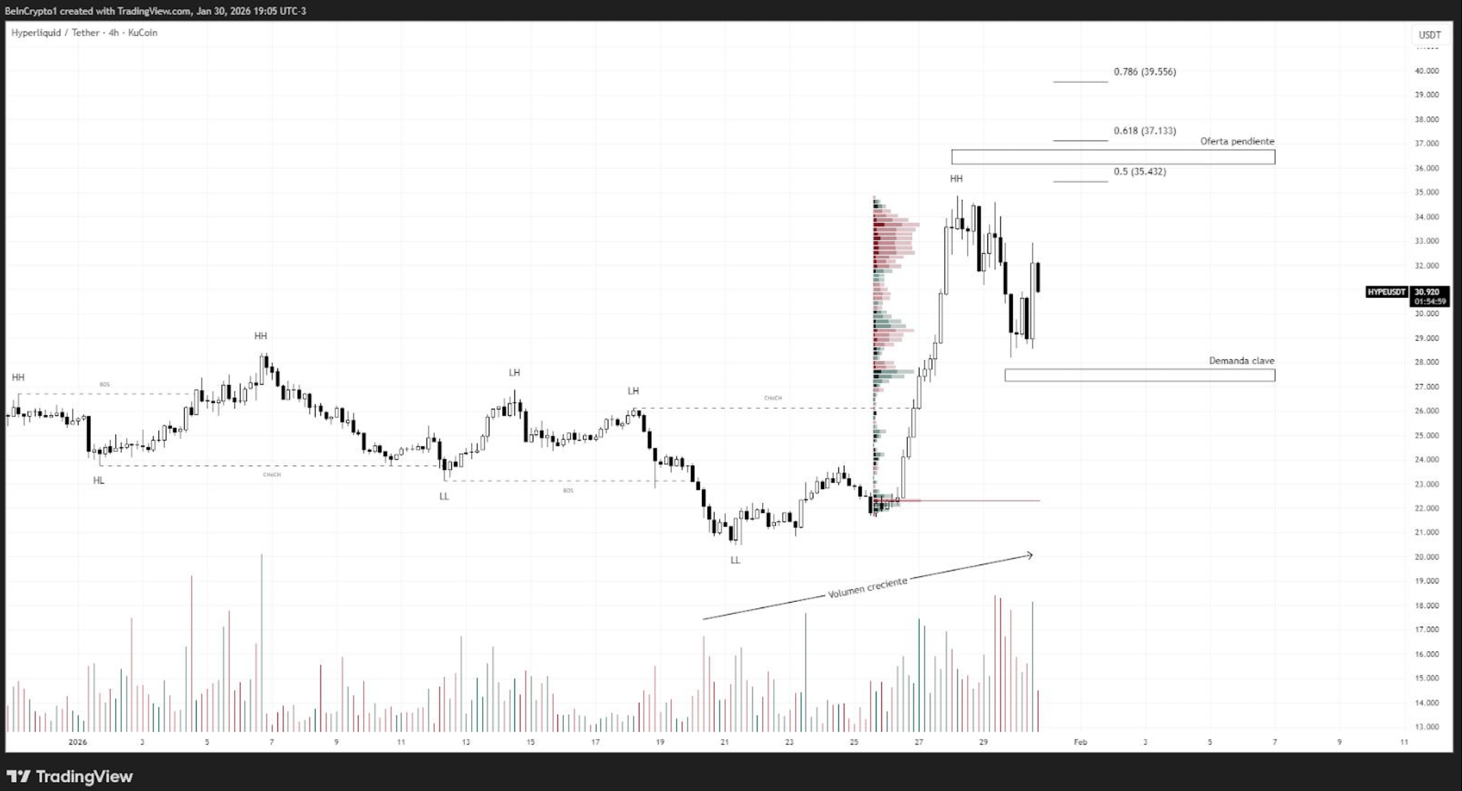 O volume tem acompanhado os movimentos de alta, o que sugere interesse sustentado por parte de participantes de maior porte. Enquanto o preço se mantiver acima da área de demanda em torno de 27–28 USDT, o cenário base aponta para uma possível extensão para a zona de 35–37 USDT, onde se concentra oferta pendente relevante.